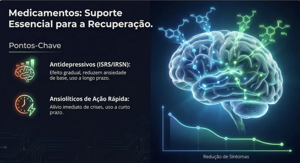 Os medicamentos tratam os sintomas biológicos, mas não ensinam habilidades para lidar com os gatilhos emocionais. A combinação de medicação com psicoterapia é sempre a abordagem mais eficaz.