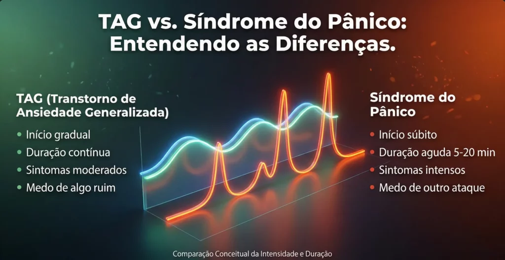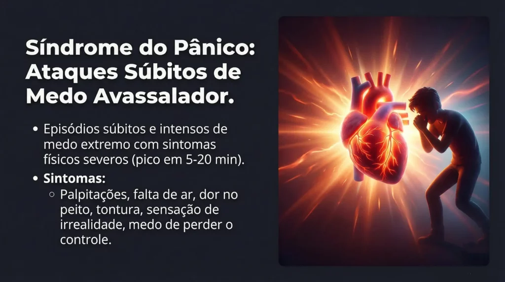 Diferente do TAG, que é uma preocupação constante, a Síndrome do Pânico é marcada por episódios súbitos e intensos de medo ou terror avassalador, conhecidos como ataques de pânico. Esses ataques atingem seu pico em poucos minutos e são acompanhados por sintomas físicos tão severos que muitas pessoas acreditam estar sofrendo um ataque cardíaco ou perdendo a razão.