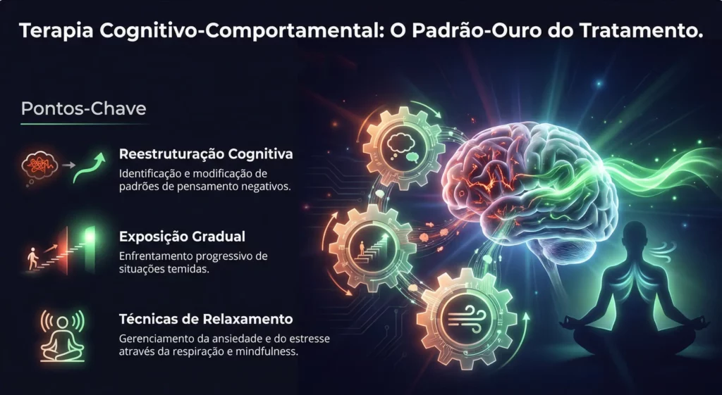 A Terapia Cognitivo-Comportamental (TCC) é considerada o padrão-ouro no tratamento dos transtornos de ansiedade. O objetivo da TCC é ajudar o paciente a identificar, questionar e modificar padrões de pensamento distorcidos que alimentam a ansiedade e o pânico.