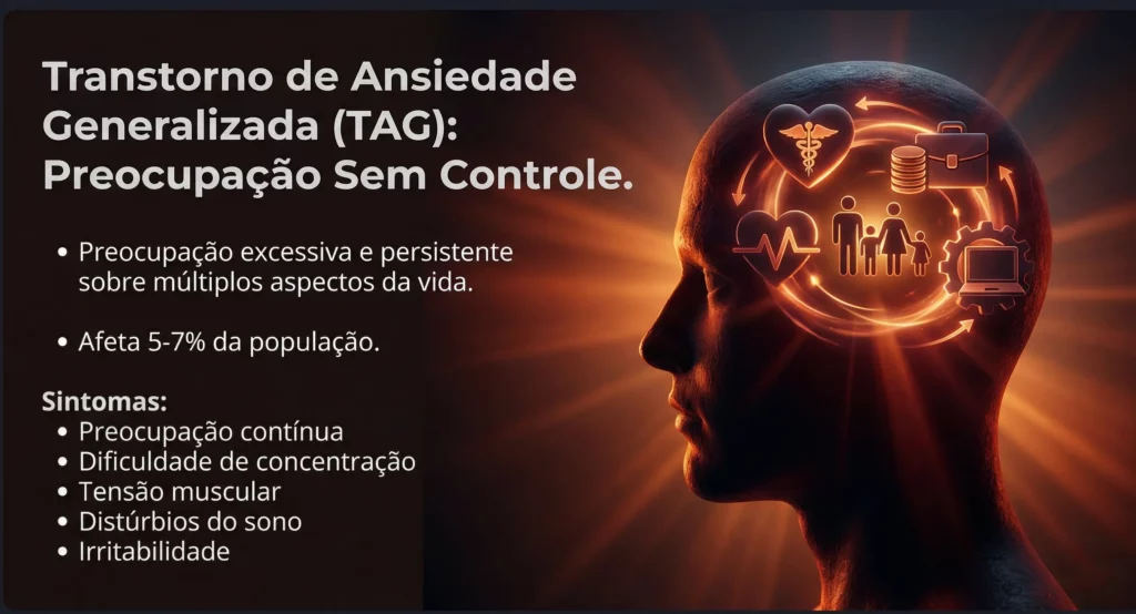 O Transtorno de Ansiedade Generalizada (TAG) é caracterizado por uma preocupação excessiva, persistente e de difícil controle sobre diversos aspectos da vida cotidiana, como saúde, finanças, família e trabalho. Mesmo quando não há um motivo aparente para preocupação, a pessoa com TAG vive em um estado de alerta constante, antecipando o pior cenário possível.